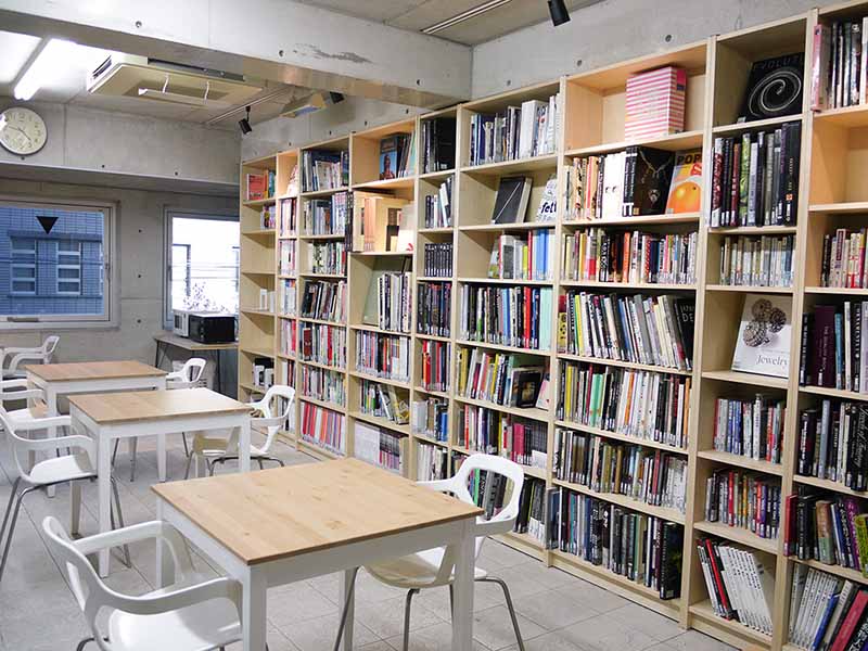 ジュエリー、時計、自転車の専門書や就職関連本が並ぶ図書室と学生ホール。