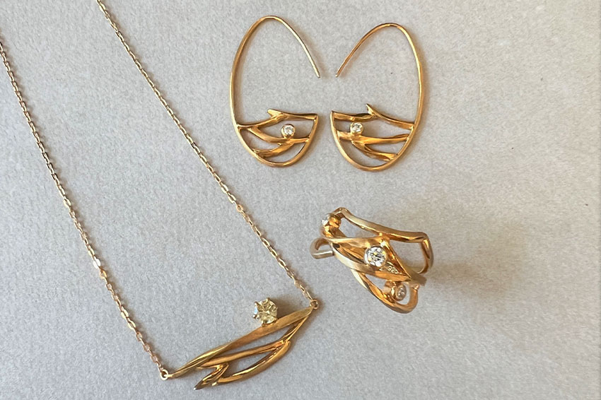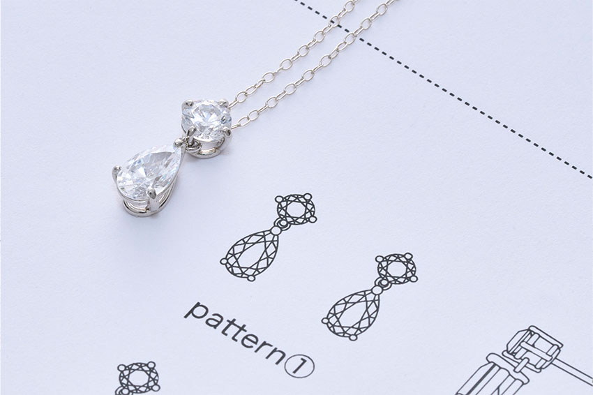 既存のジュエリーブランドをリサーチし、企業イメージやニーズ、トレンドを意識した商品を企画。セットで身につけられるようにイヤリング、ネックレス、リングをトータルでデザインします。