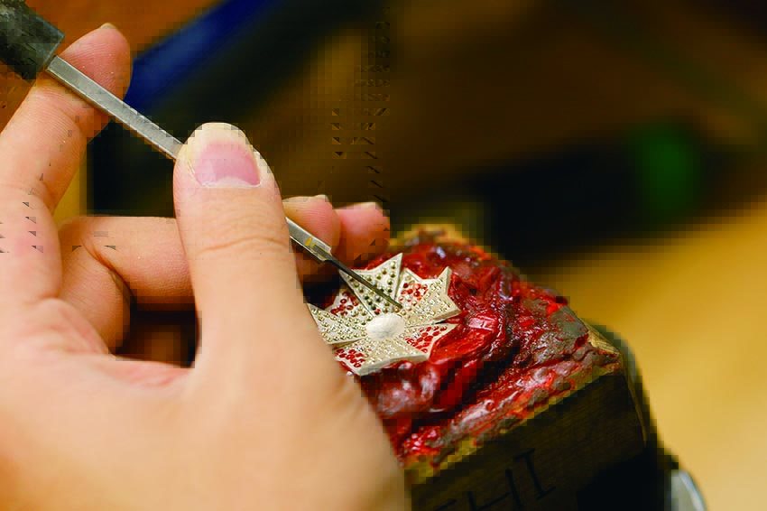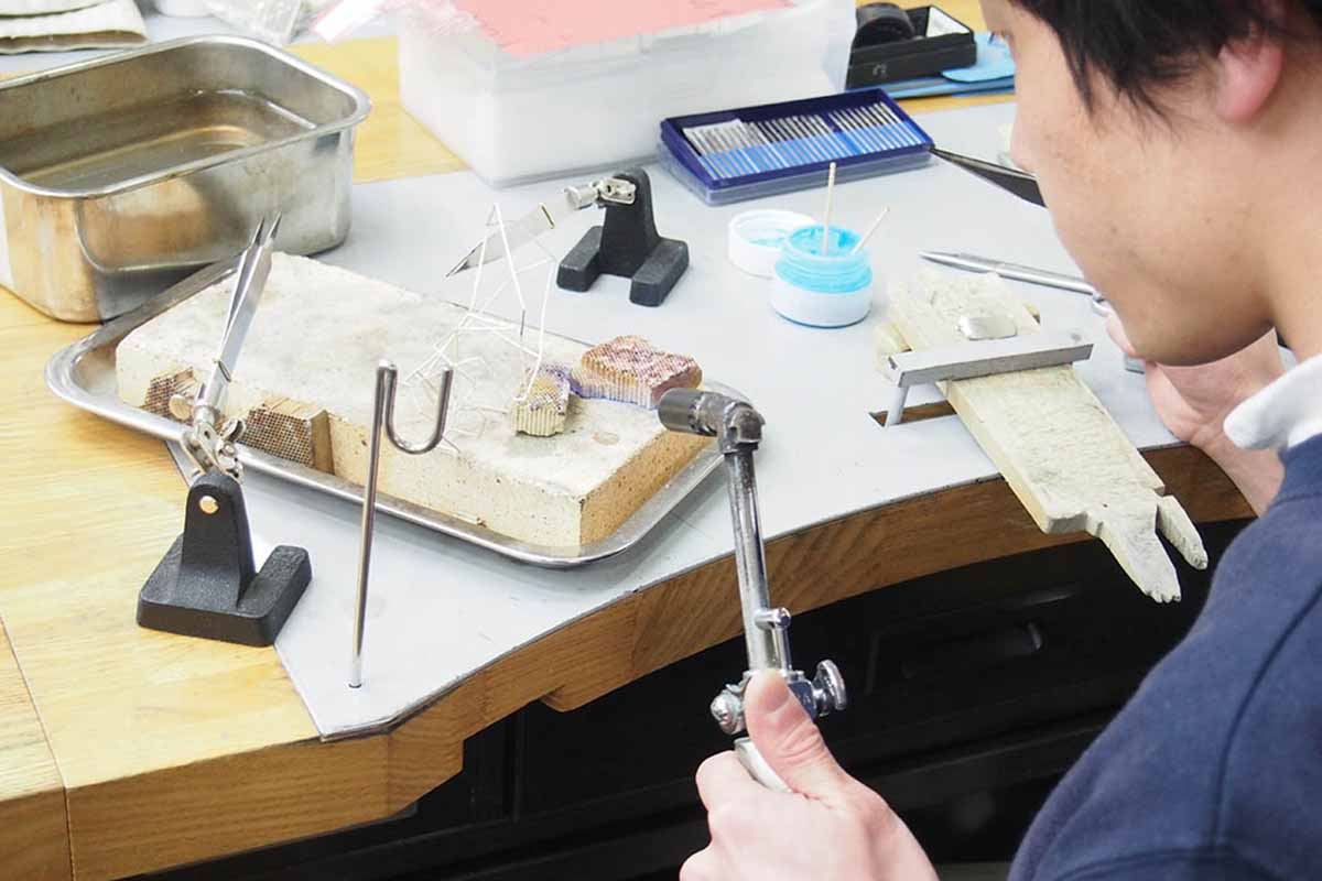 高級ジュエリー制作の一番のポイントである石留め技法。ジュエリーに施される宝石は、技術が進歩した現在でも手作業で1点1点丁寧に留められています。宝石の見え方が異なるさまざまな石留め技法を学ぶことで、ハイレベルな制作技術を修得します。