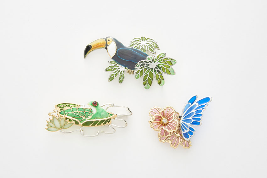 豊かな色彩を演出する上で欠かせない七宝技法。金属線を貼り付けて枠内をエナメルで埋めて装飾する「有線七宝」や、ステンドグラスのような効果を得られる「プリカジュール(透胎七宝)」にも挑戦します。