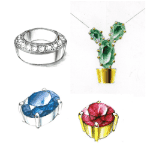 着彩表現宝石のカットの描き方、着彩の仕方、金属表現を習得。また、色彩学の基本を学び、宝石をセッティングしたオリジナルジュエリーをデザインします。