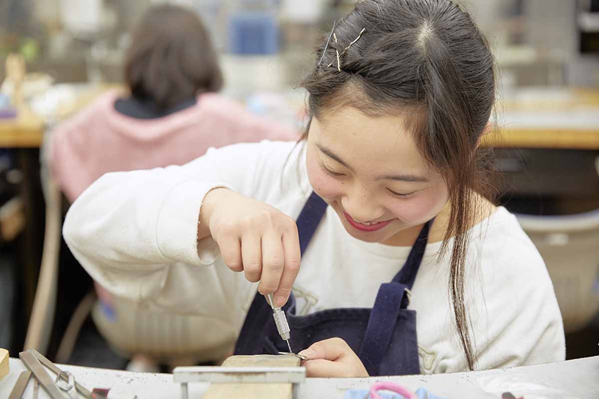 七宝技法(エナメル)/伝統技法(木目金)/ブランディング(商品化)/産学協同プロジェクト~EXHIBITION JEWELRY~/商品プロデュース/ハイジュエリーデザイン/外部での販売研修/ジュエリーCAD応用/卒業制作